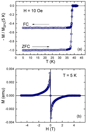 (a) Normalized magnetic moment, , measured after cooling in zero magnetic field to 5 K, applying Oe and then measuring on warming (zero-field cooling (ZFC)) above and then on cooling (field-cooling (FC)). (b) Magnetization loop, , in MgB crystal measured at 5 K.