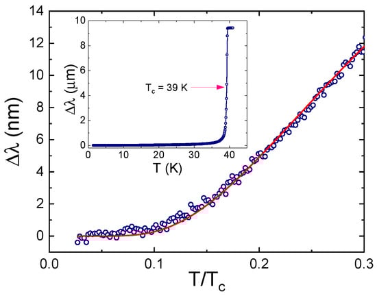 Figure 2 shows the temperature variation of London penetration depth in the same crystal of MgB used for the magnetic susceptibility measurements shown in Figure 1. The inset shows over the entire superconducting temperature range, which exhibits a sharp transition at K. In the main panel, the low temperature part of up to was shown and fitted to the s-wave BCS model, , with and being the fitting parameters. The best fitting curve shown by solid curve can be achieved with nm and . Although the fitting to a single-gap s-wave BCS function is reasonable, the obtained is much smaller than values in literature, which ranges between 84 and 116 nm [,,,]. Notably, the gap amplitude is smaller than a weak-coupling value of [], which is impossible in a single gap system. In fact, these deviations indicate either anisotropic superconducting gap or presence of multiple gaps [,].