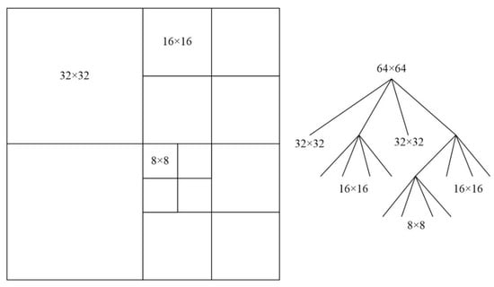 The quadtree partition structure of HEVC is one of the key technologies to improve its compression efficiency, which is shown in Figure 1. HEVC chooses to use block-based coding, in which the coding tree unit and coding unit partition can be changed according to different image content. An image to be encoded in HEVC is firstly divided into coding tree units (CTUs) of uniform size, closeness, and they are non-overlapping. According to the selected compression configuration, the maximum size of it can be 64 × 64 pixels. The CTU can be divided into smaller code units (CUs) through the quadtree structure. The rule is that if the CTU is to be divided, it must be divided into four CUs with the size of half CTU. If the CU needs to be divided further, the same rules must be followed. However, the number of layers is limited. The smallest CU size is 8 × 8, and the largest CU size is the same as CTU, which is 64 × 64.