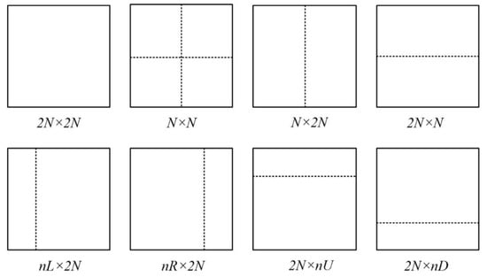 For a CU using the intra prediction mode, there are two types of PU partition, which are the same partition size as the CU and half of the CU size as shown in Figure 2. As for the inter prediction mode, HEVC adopts eight different types of divisions for CUs, which are shown in Figure 3. For a CU of 16 × 16 or bigger, the PU partition mode may select any one of the seven types except the N × N partition mode. Since the prediction residual is mainly generated by the motion of objects, the residual will be smaller if the partition of the PU blocks can better fit the boundary. HEVC calculates the residuals generated by various PU partition modes and selects the most appropriate partition mode for prediction. For the CU of 8 × 8, in order to reduce the complexity of the HEVC algorithm, it is only allowed to be divided into four types, which are 2N × 2N, N × 2N, 2N × N, and N × N.