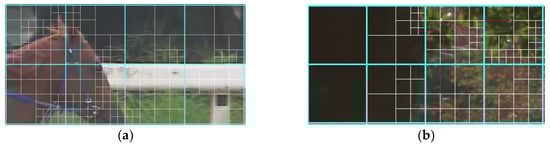 Eventually, for HEVC inter prediction, the partition of CUs and the selection of optimal PU partition modes are intended to reduce prediction residuals. For a stationary object in the video, the residual of the inter prediction is approximately 0, so the CU size will be large, and the PU partition mode will be simple. But for moving objects, there are often more prediction residuals in the boundary, so more precise CU and PU partition modes are required to adapt to the more accurate shape of the moving target, which results in CUs with smaller sizes. Figure 4 shows two CU partitioning examples at different resolutions of 1920 × 1080 and 832 × 480, where the green line represents the boundary of the CTU, the white line represents the boundary of the CU, and the red line represents the PU partition boundary, which is different from the size of the CU. It can be seen from Figure 4 that although their resolutions are different, the still parts of a large piece such as the tree trunk in Figure 4a and the background in Figure 4b, the size of CUs is . However, as for the boundary of moving objects, such as the horse in Figure 4b, the number of CUs of  is dominant. Thus, the partition size of CU and PU in a frame are closely related to the video content.
