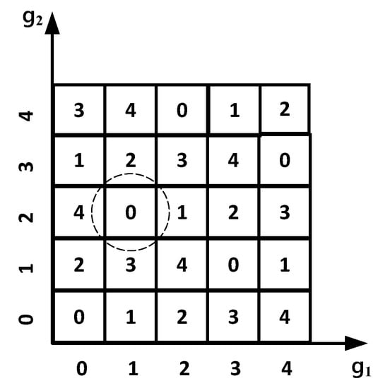 where [ ] means rounding operation. For example, if , the range of the space coordinate will be {0, 1, 2, 3, 4} according to Equation (1). Secondly, according to Equation (2), we can obtain the points’ values in the 2-dimensional lattice as shown in Figure 7.