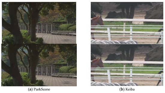 Subjective performance evaluation of the second P-slices from: (a) ParkScene 1920 × 1080; (b) Keiba 832 × 480. The clean slices without embedded information are laid on the first line, and slices with hidden information are placed in the second line.