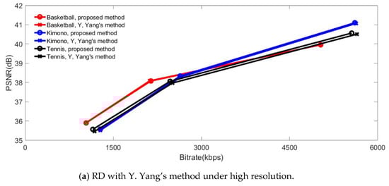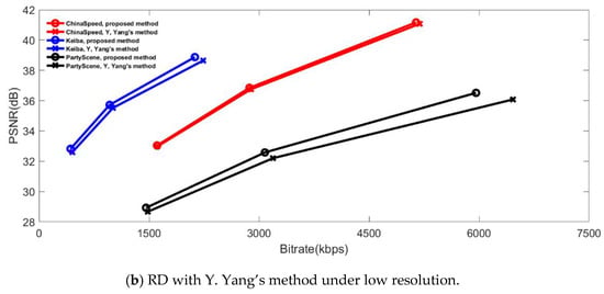 Comparison of distortion (RD) with Y. Yang’s paper ([]): (a) RD of BasketballDrive 1920 × 1080, Kimono 1920 × 1080 and Tennis 1920 × 1080; (b) RD of ChinaSpeed 1024 × 768, Keiba 832 × 480 and PartyScene 832 × 480.