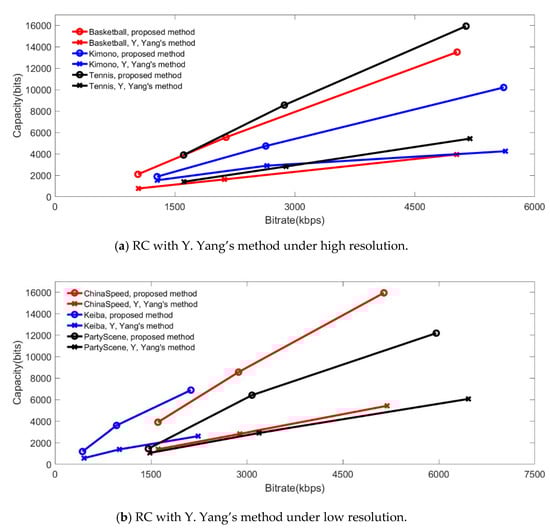 Comparison of capacity (RC) with []: (a) RC of BasketballDrive 1920 × 1080, Kimono 1920 × 1080 and Tennis 1920 × 1080; (b) RC of ChinaSpeed 1024 × 768, Keiba 832 × 480 and PartyScene 832 × 480.