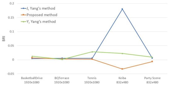 For some sequences like Keiba and PartyScene, even though a specific frame introduces a little more redundancy after modification, this modified frame has a stronger correlation with the following frame, and in inter-prediction mode, stronger correlation results in less redundancy of several continuous frames in a second. Because BRI represents the bit number increase per second, and the frame rate is 25 frames per second, if the redundancy of 25 frames becomes smaller after modification, the BRI will be negative.