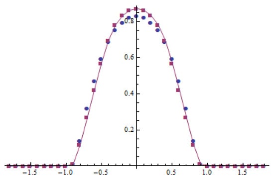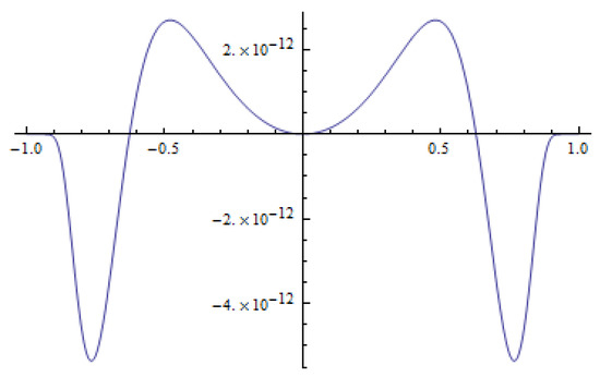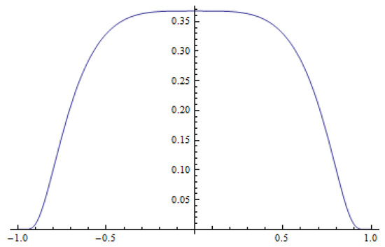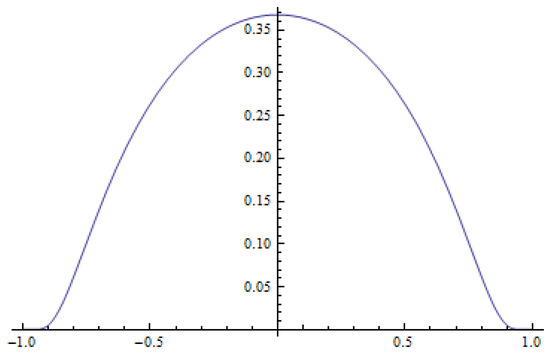 where is the normalizing coefficient. The initial datum has a single peak in the middle of the interval (see Figure 6), moreover, which has the second order derivative that is equal to zero in (see Figure 7). Therefore, the initial datum is “weakly” concave. The behavior of and its second order derivative is presented in Figure 6 and Figure 7. One can see that the initial datum satisfies conditions given in [4] (see Theorem 3.1). Therefore, the method of lines for anti-diffusion transforms the unipolar initial function into the bipolar solution with twin peaks which move away from zero.