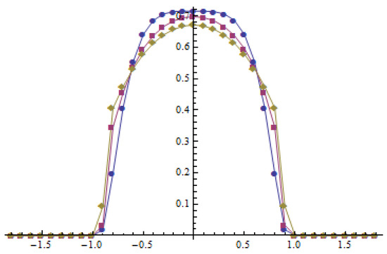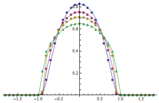 If the time derivative is negative in a neighborhood of zero and (see Figure 2), then the maximum of the initial function is transformed into a smaller value (see Figure 3). Therefore, the solution to (19) with is dispersive. Otherwise, the maximum of the solution to (19) is increasing (, see Figure 4 and Figure 5), and the solutions are not dispersive. The time derivative of the solution for does not have any positive twin peaks in the neighborhood of (see Figure 4), which indicates that the solution for anti-diffusion is unipolar. This follows from the fact that the initial datum and its derivatives satisfy the conditions given in [4] (cf. Theorem 3.1).