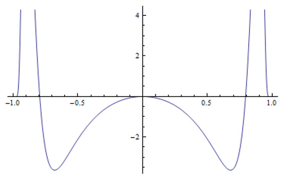 The bipolarity can also be observed in the context of the time derivative for the initial function. The initial function in “weakly” concave in . The time derivative for and has symmetric positive twin peaks (see Figure 8). Using the formula (21) one can observe that the values of the time derivative given in the twin peaks added to the values of the initial function in the same points are significantly increasing the value of the initial function. Therefore, the bipolar behavior is observed (see Figure 9).