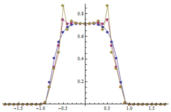 Consider . It follows from Proposition 1 that for the -norm and non-negativity of the solution are preserved. The same properties remain for . The method of lines for is stable, unlike for . The evolution of the solution is presented at Figure 3 and Figure 5.