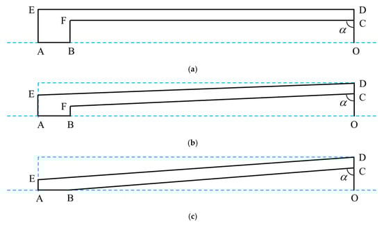 The range of angle α can be obtained under the condition that the wall thickness of the outer casing and the sealing thickness of projectile rear are unchanged. The geometric structure of the truncated cone-shaped PELE projectile corresponding to the different angle α is shown in Figure 3. The radius of outer casing is OD = 5 mm, the wall thickness of outer casing is CD = 2 mm, the length of projectile is OA = 50 mm, and the sealing thickness of projectile rear is AB = 5 mm.