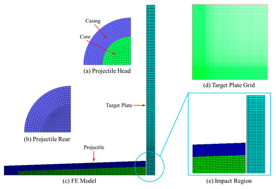 In the process of experiment, PELE projectiles are fired by guns to obtain initial velocity, and then hit the target plate—the target is usually fixed around. In the simulation process, we directly set specific values for the initial velocity of the projectile in the software to equivalent to that of the velocity of the projectile obtained by the explosive driving under the actual conditions. As for the target plate, the fixed boundary and transmissive boundary condition is applied to the edge of target plate. By adding such boundary conditions to the target plate, we can approximate that the finite size target can reflect the characteristics of a semi-infinite target. In addition, it is assumed that the projectile impacts the target in a normal incidence attitude. Since the truncated cone-shaped PELE projectile is still symmetrical, the model can adopt 1/4 simplification under the vertical impact condition. The schematic diagram of the finite element model is shown in Figure 4. In order to clearly show the local contact details between the projectile and target plate, the after-effect target is not shown in Figure 4.