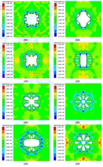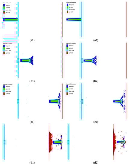 Schematic diagram of penetration process of the conventional PELE projectile and the truncated cone-shaped PELE projectile corresponding to #5 working condition. (a1~d1): Conventional PELE projectile; (a2~d2): Truncated cone-shaped PELE projectile. (a1) t = 0 µs; (a2) t = 0 µs; (b1) t = 47 µs; (b2) t = 40 µs; (c1) t = 126 µs; (c2) t = 108 µs; (d1) t = 174 µs; (d2) t = 148 µs.