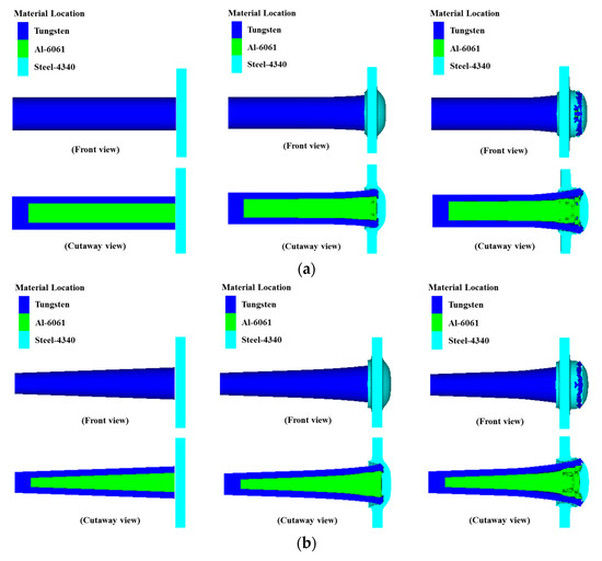In order to visualize the penetration process of PELE projectiles, this paper takes the #5 working condition as an example and four typical moments were selected, as shown in Figure 5.