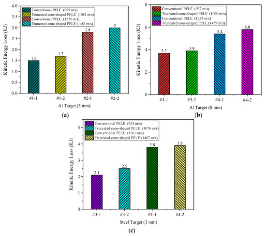 Histogram of kinetic energy loss of the conventional PELE projectile and the truncated cone-shaped PELE projectile penetrating the target plate. (a) 3 mm Al target plate; (b) 8 mm Al target plate; (c) 3 mm steel target plate.