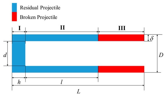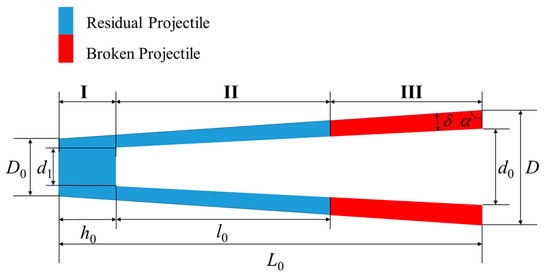 Next, the relationship between the fragment conversion rate and the residual length of the two different types of PELE projectile will be established respectively. In order to analyze the fragment conversion rate intuitively, the entire projectile body is divided into three parts: Projectile rear, unbroken hollow casing, and broken hollow casing which has been converted into fragments. The simplified diagrams of the failed conventional PELE projectile and the truncated cone-shaped PELE projectile are shown in Figure 8 and Figure 9, respectively.