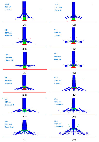 The status of two different types projectile before impacting the after-effect target. (a1–f1): Conventional PELE projectile; (a2–f2): Truncated cone-shaped PELE projectile.