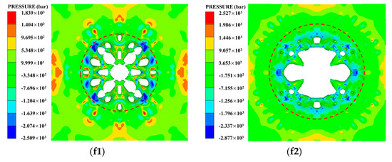 Based on the kinetic energy loss after the projectile perforating the target plate shown in Table 5 and Figure 7, it can be seen that the difference of kinetic energy loss between the two different types of PELE projectile is quite small, which indicates that the penetration ability of the two projectiles is quite close. In other words, the penetration ability of the truncated cone-shaped PELE projectile is guaranteed and there is no significant reduction. Although the kinetic energy loss of the two kinds of projectiles is quite close, it can be found that the kinetic energy loss of the truncated cone-shaped PELE projectile is slightly larger than that of the conventional PELE projectile through comparative analysis of all working conditions. The reason for this phenomenon may be related to the resistance of the projectile when it penetrates the target plate.