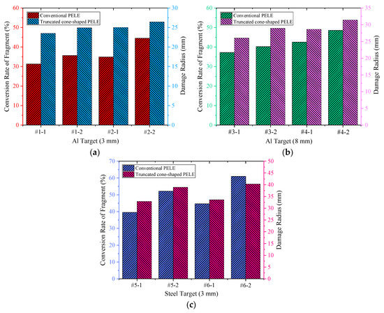 Comparison of the fragment conversion rate and damage area radius under different working conditions. (a) 3 mm Al target plate; (b) 8 mm Al target plate; (c) 3 mm steel target plate.