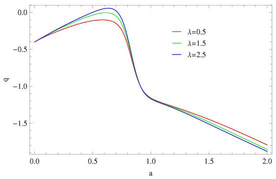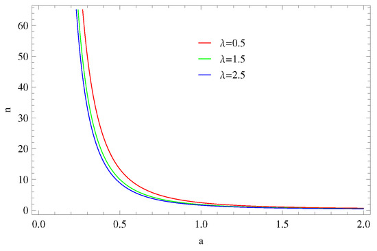 Here, , , and for . In Figure 7, q shows the positive behavior versus a, which represents the decelerated phase of the universe. Figure 8 exhibits the positive behavior of versus a, which shows that the temperature of the system is decreasing. Figure 9 exhibits the positive behavior of n versus a, which means particles are being produced.