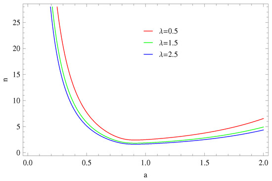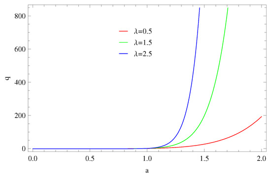 and H, can be taken from Equations (31) and (33). By utilizing all the required values in (61), we get the expression of thermal equilibrium for this model. The plot of versus a for three different values of of Model 2 is shown in Figure 14. The graph shows the compatibility of thermal equilibrium in the range of by taking the same constants.
