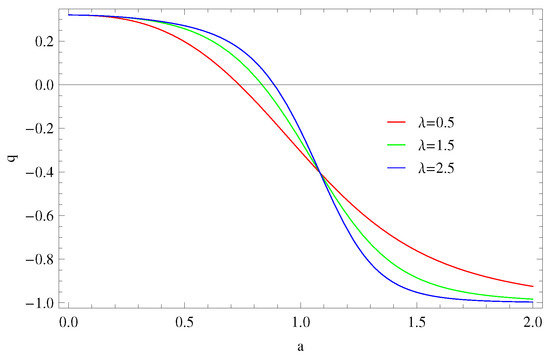 In Figure 1, q shows the negative behavior versus a, which represents the accelerated phase of the universe. The ranges of this parameter lie within the constraints as mentioned in [73]. Figure 2 exhibits the positive behavior of versus a, which shows that the temperature of the system is increasing. Figure 3 shows the positive behavior of n corresponding to a, which means particles are being produced.