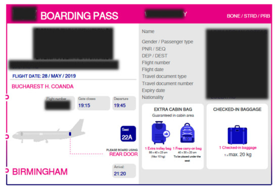 Being aware that airports employ apron buses for boarding purposes and want to reduce the turn time of their flights, some airline companies have adjusted their tickets to improve their passengers’ traveling experience by adding images suggesting which of the two doors of the airplane passengers should enter based on their seat in the airplane. Figure 1 provides an example of such a ticket issued by a European airline company in which the rear door is suggested for the boarding of a passenger having seat 22A.