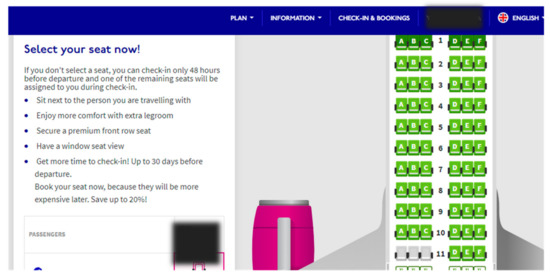 Boarding strategies describe the sequence in which passengers (or groups of passengers) board an airplane. Ferrari and Nagel [9] assert that the efficiency of a boarding strategy may depend on the aircraft occupancy. In this paper, we aim to test the two-door boarding methods initially suggested in Milne et al. [7] for a fully loaded (i.e., fully occupied) airplane, for a different situation when the airplane is just partially loaded with passengers, by examining a 60%–90% occupancy rate. Furthermore, as some of the airline companies offer their passengers the choice of selecting their seats through a mobile application or website (see Figure 2), two seating situations are considered: the first one (random seat assignments) refers to the case in which the airline company assigns the seats to the passengers randomly without using any particular scheme, while the second one (preferential seat assignments) assumes that the passengers have the option to select their seats prior to boarding through a software application or an airline webpage. To model the seat selection process the passengers might employ prior to boarding, we utilized results from a questionnaire that is summarized in Delcea et al. [8]. Through the questionnaire, Delcea et al. [8] gathered passengers’ relative preferences for a window/middle/aisle seat, a seat in a row near the front/middle/rear of the airplane, and a preference/indifference/antagonism to crowded areas. Of those passengers expressing a particular preference as being “highly desirable,” a window seat and a row close to the front of the airplane are the most popular choices. A middle seat is the most “highly disliked” choice. For better simulation of the considered situations, an agent-based model in NetLogo [10] was created and calibrated in accordance with the on-the-field observations made throughout the literature [11,12,13,14,15,16,17,18]. The BehaviourSpace tool offered by NetLogo has been used for simulations [19]. As a result, the two-door boarding methods were hierarchized based on the average time to complete passenger boarding and the obtained results with partial occupancy conditions are compared to the case with a fully occupied airplane.