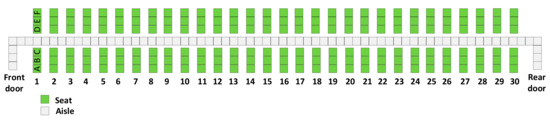 The remainder of the paper is organized as follows. Section 2 presents a brief literature review on both the classical methods used for one-door boarding in the presence of a jet bridge and on some of the papers addressing boarding methods for the case in which the apron buses are used. In this section, some of the methods presented in the literature for the apron buses boarding situation are presented, along with their results with a fully occupied airplane. An Airbus A320 configuration with 30 seat rows, as in Figure 3, is used as suggested by References [11,20]. Section 3 describes aspects related to passenger movement and luggage assumptions. In this section, we also discuss two types of passengers’ seat assignment: random and with seat preferences. Section 4 considers the two situations related to passengers’ seat assignment and, by using an agent-based model developed in NetLogo 6.1.0, tests the boarding methods for the case of partially occupied airplanes to determine which methods result in the fastest boarding time when a series of elements are varied, such as the number of passengers boarding the airplane carrying small and big hand luggage, the type of the luggage, and the aircraft passenger occupancy load. The results are also discussed in Section 4. The paper concludes with a brief summary of highlights and directions on how the research can be further extended.
