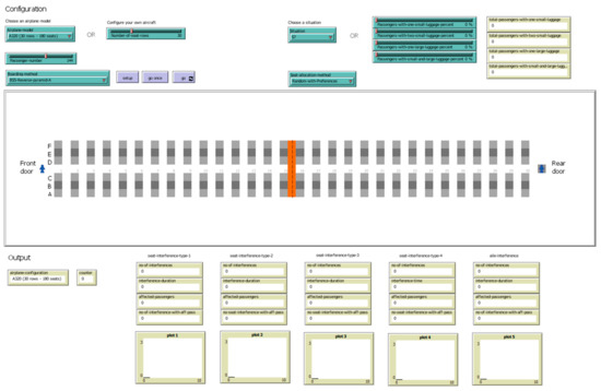 In order to simulate the methods introduced in Table 2 for a partially occupied airplane, an agent-based model in NetLogo was developed (please see Figure 8).