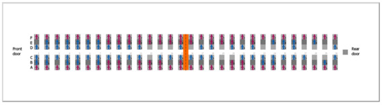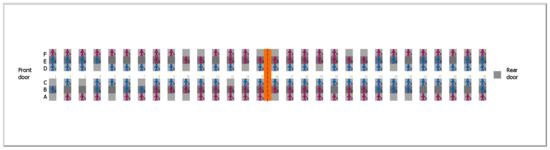 Figure 10 and Figure 11 present two examples of passengers’ seat assignment for the two cases: random seat assignments and preferential seat assignments, both with an 80% occupancy level.