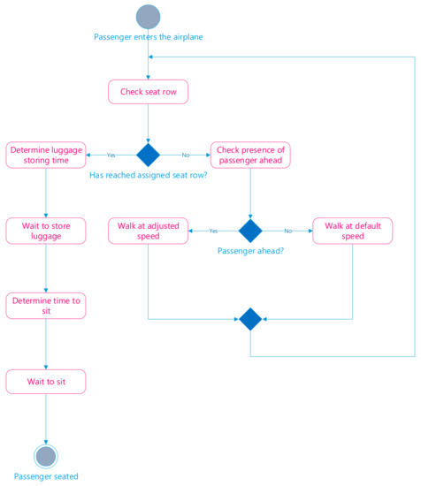 The agent behavior from entering the airplane through sitting in its assigned seat is presented in Figure 12.