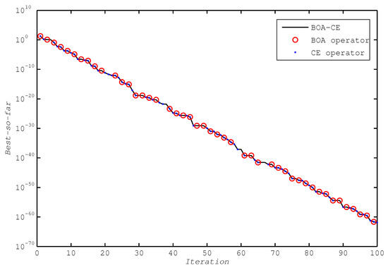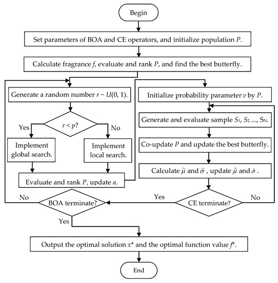 - The BOA, which mimics the food foraging behavior of butterflies in nature, has the advantage of a fast convergence rate. Based on co-updating, the BOA-CE uses the excellent individuals obtained by the BOA operator to update the CE operator’s probability parameters during the iterative process, which speeds up the convergence rate of the CE operator.