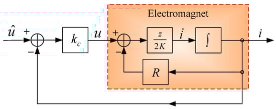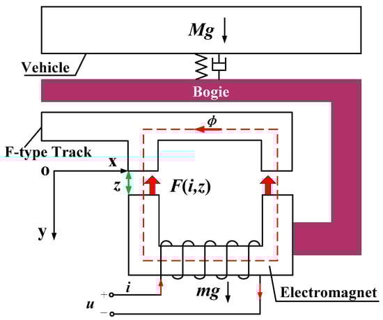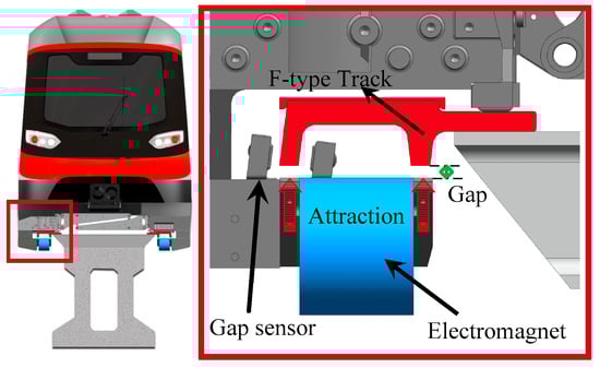 As shown in Figure 2, the magnetic levitation control system consists of a suspension controller, a gap sensor and an actuator, which is the electromagnet. The gap sensor measures the gap between the electromagnet and the F-type track constantly. The suspension controller calculates the control quantity according to the measured gap signal to adjust the current of the electromagnet in real time. When the current varies, the intensity of the closed-loop magnetic field established between the electromagnet and the F-type track will change accordingly. The electromagnetic force will consequently vary and make the electromagnet fall or float to levitate the maglev train in the target gap.