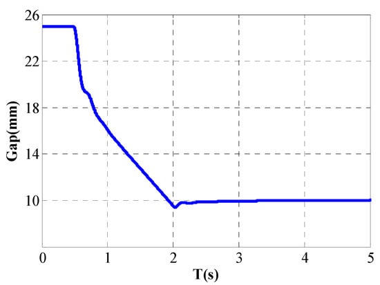 The initial gap for the electromagnet was set to 25 mm and the desired gap was set to 10 mm. The suspension gap of the electromagnet when the floating instruction was issued is presented in Figure 7.