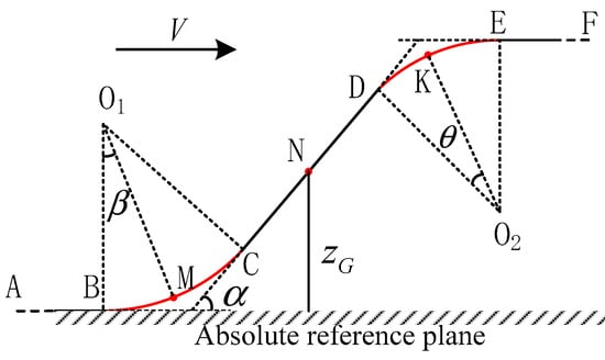 As described in Figure 8, the profile of a maglev train line is composed of five parts, the strait section , the concave curve of section , the oblique curve of section , the convex curve of section and the strait section . The radius of circular curve is and the angle of slope is . The displacement of the track relative to the absolute reference plane is . It is assumed that the tangent velocity along the track is and remains constant.
