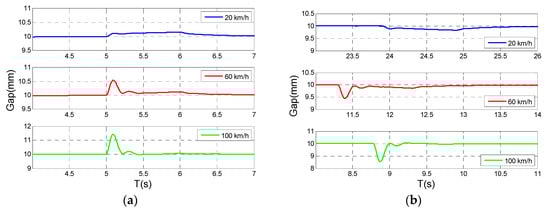 As described in Figure 10, the tracking performance of a magnetic levitation system when passing through the vertical track irregularity in a maglev train line was investigated and achieved. The suspension gap will fluctuate upward or downward, and stabilize in the set gap after a period of time. It is apparent that the fluctuation of the suspension gap becomes more and more serious with increases in speed. At some stages, the tracking performance of the magnetic levitation system is extremely awful and unacceptable, and the electromagnet is prone to collide with the F-type track.