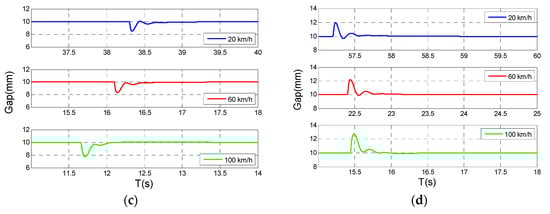 To illustrate the foregoing analysis and discussion, a number of significant simulations and investigations were performed to check the tracking performance of the magnetic levitation system when the vertical curve is passed. In order to test the validity, we performed several sets of comparative analyses. Compared with a nominal controller, the maximum fluctuations of the suspension gap at different speeds by utilizing the new strategy are described in Figure 14.