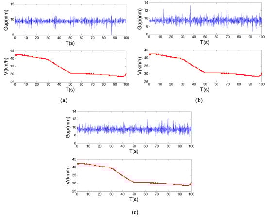 In order to observe the tracking performance of the maglev train passing through the above sections, the suspension gap and running speed need to be measured and recorded. The magnetic levitation system sends data to the on-board computer every 100 ms through the CAN network, and these data are stored in the on-board computer. In the Changsha maglev express line, the Mc1, M and Mc2 maglev trains are organized into groups. Each maglev train has 20 sets of magnetic levitation systems. The suspension gap and speed of the tenth suspension point in each maglev train were selected and observed in Figure 18.