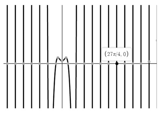 Let and be the left and right side of Equation (40). It is easy to show that . Then by Rouch’s theorem and have the same number of zeros. The zeros of the function are near to , for a sufficiently large integer n, see Figure 1. Hence we obtain (38) and (39). □