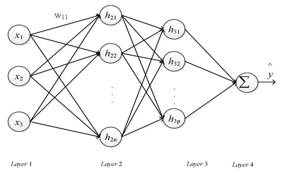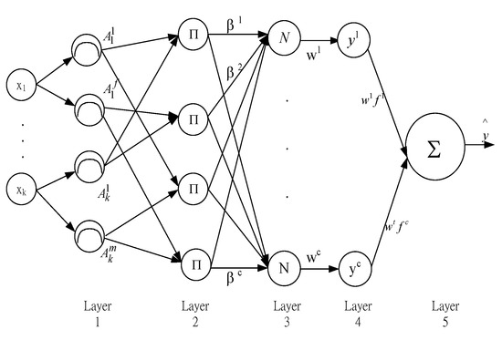 Layer 4: Each adaptive node, marked with i, at the layer represented an output variable of consequent explicit function and was used for completing the computation as shown in Equation (4); where, c was the number of rules.