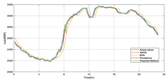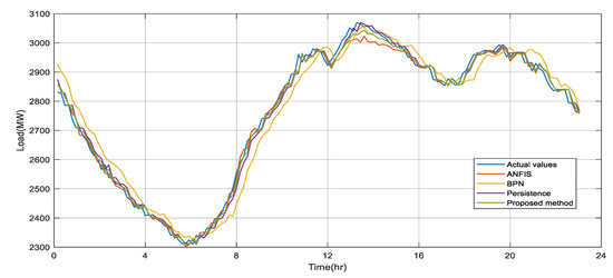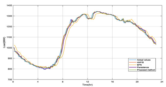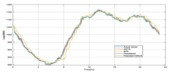 In order to forecast workday ultra-short-term electric power load across Taiwan, ANFIS, BPN and persistence, and integrated search were used in this paper to forecast electric power consumption load across Taiwan on 20 June 2017. Comparison results are as shown in Figure 7. The representation of lines in Figure 7 is the same as that in above experiments.