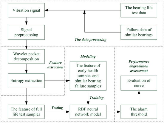 To this end, this paper proposes a combination of WPEE and RBF neural network performance degradation assessment method. In light of the advantages of WPEE in dealing with vibration signals, an RBF neural network is applied to quantitatively evaluate the performance degradation. In this paper, the feature of rolling bearing data is extracted by WPEE. The model of the RBF neural network, by using early faultless samples and similar bearing failure samples, is established, and the bearing life test data is input into the model through iterative methods to obtain the performance degradation evaluation curve, which is established as the threshold curve. The box plot is calculated based on the actual existing data. The curve can be adjusted adaptively, and the early fault point of the bearing is determined according to the intersection of the threshold curve and the performance degradation evaluation curve. In the experimental part, the discrete seeded fault bearing test data was used first to verify the ability to distinguish the bearing faults of different sizes, and then the feasibility of the method was tested with the whole life test data of bearings that were obtained from healthy operation to failure. Three RBF neural network models with different radial basis functions were selected for the performance degradation evaluation curve, and the optimal Gaussian basis function was selected as the radial basis function to act as a comparison. The performance degradation assessment curve is made by using the commonly used monitoring indicators, which is compared with the proposed method, to highlight the superiority of the proposed method. Finally, the envelope demodulation is used to verify the accuracy of the experimental results, and the rolling bearing accelerated fatigue life test is conducted to verify the feasibility of the method.