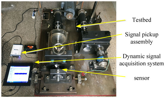 The QPZZ-II fault simulation test bench is adopted to conduct the experiment. It is mainly composed of variable speed drive motor, main shaft, biasing turntable, governor, gear box and bearings. The spindle is driven by the drive motor through the belt, the drive power is 0.55 KW, and the bearing is mounted on the right side of the spindle. Figure 5 shows the test bench and the acquisition device.