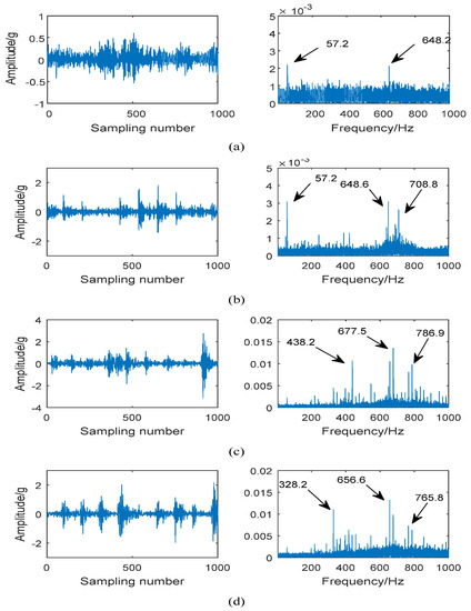 Time domain and spectrum diagram of normal sample and fault sample: (a) The normal sample; (b) The fault sample of 0.05 mm; (c) The fault sample of 1.00 mm; (d) The fault sample of 1.50 mm.