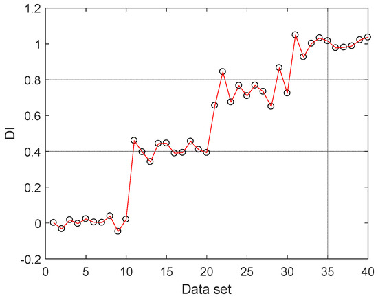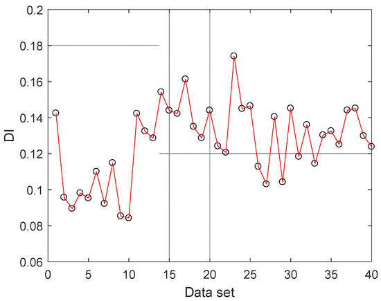 In Figure 10, it can be seen that early failure occurred at the 533th bearing and the DI value increased significantly. The bearing was in the early failure stage before the 699th sample, after which the bearing repeated wear and failure deepened. After the 964th sample, the rolling bearing had completely failed.