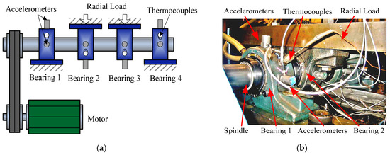 The experimental data which was collected by using the bearing fatigue life test bench is obtained from the Intelligent Maintenance System Center of the University of Cincinnati, USA [37]. The test bench is shown in Figure 9: