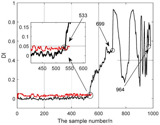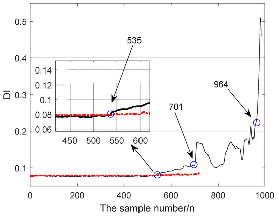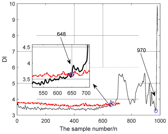 The first 100 sample of early fault-free data and the last 10 samples of failure data in the life-time data are selected as samples, and the features are extracted by WPEE, and a 110 × 8 input matrix is constructed, input the RBF model, and the model is trained to obtain the cluster center. After obtaining the performance degradation evaluation model, the 982 sets of full-life data are taken as samples, and the features are extracted. A test sample matrix of 982 × 8 is constructed and input into the model through iterative method to obtain the DI value in the bearing life cycle. After smoothing it, the performance degradation state is obtained as shown in Figure 10. In the following result analysis, the red curve is the threshold curve drawn by the boxplot, and the black curve is the performance degradation evaluation curve.