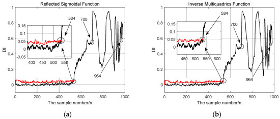 The Reflected Sigmoidal function and Inverse Multiquadrics function are respectively used as radial basis functions, and the output bearing performance degradation evaluation results are shown in Figure 11.
