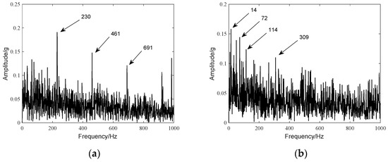 The results of the proposed method are demodulated by envelope spectrum analysis, and the results are shown in Figure 13. Among them, Figure 14a shows the analysis result of the 533th sample, and Figure 14b shows the analysis result of the 532th sample. It can be seen that there is an obvious spectrum peak at the frequency with 230 Hz in Figure 14a, which is close to the BPFO with 236.4 Hz. Also, an obvious harmonic frequency characteristic exists. Moreover, the envelope spectrum of 532th sample depicted in Figure 14b shows no obvious spectrum peak at the frequency close to the BPFO (the samples before the 532th sample show the same results). The fundamental reason for the difference between the failure characteristic frequency and the theoretical characteristic frequency is the existence of skidding effect [46]. Therefore, the RBF neural network model concludes that the initial failure results are consistent with the verification results.
